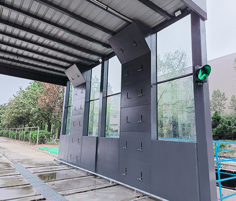 (3)洗車臺(tái)龍門(mén)設(shè)計(jì)結(jié)構(gòu)由矩形管立柱、橫梁、矩形管鋼構(gòu)框架和透明采光材料組成,側(cè)柵采用一體化封閉結(jié)構(gòu),此設(shè)計(jì)結(jié)構(gòu)可避免沖洗水大量流出沖洗區(qū)域,達(dá)到環(huán)保政策文件環(huán)保要求,同時(shí)能夠節(jié)省水資源;另外側(cè)柵整體美觀大方,外部使用透明板材質(zhì)設(shè)計(jì),用戶可自由裝飾,進(jìn)行涂鴉外觀美化。